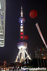 十月十一日,法國總統(tǒng)希拉克抵達上海訪問。上海浦東東方明珠電視塔用紅、藍、白三色彩燈迎接貴賓到訪。作者:潘索菲