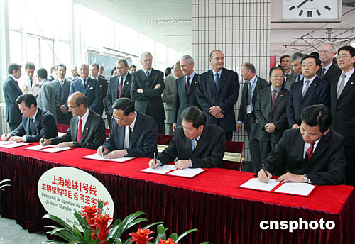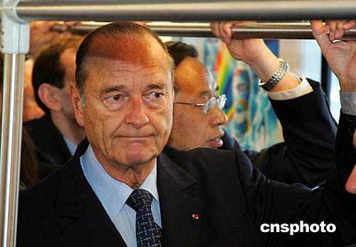 十月十二日,法國總統(tǒng)希拉克參觀、乘坐上海軌道交通三號線,并見證“上海地鐵一號線車輛續(xù)購項(xiàng)目合同簽字儀式”。上海申通集團(tuán)有限公司將購置一百二十八輛中法合作生產(chǎn)的地鐵車輛,二十二個(gè)月后這些車輛將陸續(xù)投入營運(yùn)。作者:潘索菲