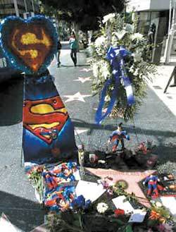 享年52歲的“超人”克里斯托夫·里弗墜馬癱瘓后對抗病魔的毅力與勇氣深植影迷心中,從10月11日開始,在美國好萊塢星光大道上,人們駐足拍攝擺放在已故演員克里斯托夫·里弗名字前的照片、短信和鮮花。而當年《超人》電影在紐約的拍攝景點——“超人”擔任記者的報社大樓,也有許多影迷前往憑吊。電影中,“超人”每天上班的報社“DAILYPLANETNEWS”所在的大樓,隨著電影的走紅而有了“超人大樓”的稱號,所以在克里斯托夫·里弗過世的消息傳出后,紐約人紛紛來到這里懷念心中的偶像。一名紐約影迷說:“這是‘超人’大樓,大家都會來這里看有名的地球標志,這同時也是新聞大樓,是有名的觀光景點。”