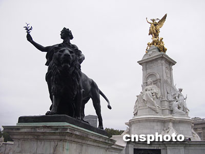 英國(guó)白金漢宮正面廣場(chǎng)外的維多利亞女王雕像。金色的雕像矗立高端,為手持權(quán)杖的天使形象。余瑞冬 攝