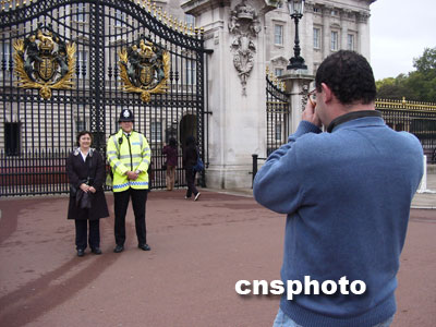 在白金漢宮門前,面帶微笑的英國(guó)警察(黃衫者)成了各國(guó)游客合影的對(duì)象。余瑞冬 攝