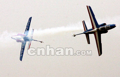 果然,經(jīng)過(guò)十多分鐘平淡無(wú)奇的單飛后,1號(hào)飛機(jī)著陸了,7號(hào)、8號(hào)飛機(jī)相繼升空。3時(shí)38分,兩架飛機(jī)做了當(dāng)天最驚險(xiǎn)也是惟一驚險(xiǎn)的動(dòng)作——對(duì)飛閃避:兩架飛機(jī)南北相向飛行,當(dāng)距離20米左右時(shí),兩機(jī)各向外側(cè)翻轉(zhuǎn)90度,兩機(jī)擦身而過(guò),藍(lán)色和紅色的尾煙在天空劃出一道美麗的弧線。看到的觀眾一片驚呼,沒(méi)看到的大失所望。10分鐘后,表演順利結(jié)束。