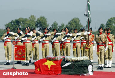 王鵬的靈柩上覆蓋著中巴兩國國旗,上面擺放著由鮮花組成的兩個花圈,在低沉悲涼的哀樂聲中,巴基斯坦陸軍儀仗隊(duì)為這位在人質(zhì)事件中遇難的中國朋友舉行了莊嚴(yán)肅穆的遺體告別儀式。6名巴基斯坦禮兵將靈柩慢慢抬起,沿著紅色的地毯,緩緩走向運(yùn)送遺體的專機(jī)。