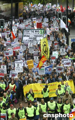 來自英國各地和歐洲大陸的數(shù)萬民眾10月17日在倫敦市中心舉行反戰(zhàn)示威游行,呼吁美英軍隊(duì)結(jié)束對(duì)伊拉克的“非法占領(lǐng)”。