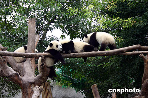 圖:憨態(tài)可掬的大熊貓幼仔玩耍嬉戲