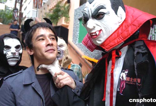 萬圣節(jié)將臨,香港尖沙咀最新型人蒲點的諾士佛階,二十日率先展開迎接萬圣節(jié)活動,圖為扮成嘩鬼的男士與出席活動的男模吳嘉龍做戲。作者:錢興強