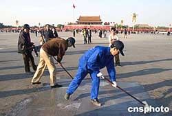 10月23日,清潔工人正在北京天安門(mén)廣場(chǎng)對(duì)已經(jīng)發(fā)黑的花崗巖地面進(jìn)行清洗。清洗工作完成后,廣場(chǎng)地面將恢復(fù)淡粉色原貌。清洗工作原計(jì)劃在十天內(nèi)完成,但由于污漬太多,加上清理口香糖等污漬難度大,估計(jì)此次廣場(chǎng)大“洗臉”將會(huì)延期完成。作者:張煒