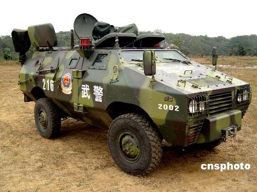 2004年10月25日,在武警某部訓(xùn)練場(chǎng),新型防暴運(yùn)兵車(chē)和防暴裝甲車(chē)與武警“反恐”隊(duì)員配合,共同實(shí)施“反恐”演練。該型防暴車(chē)為中國(guó)自行生產(chǎn),使用防彈鋼板制造,可有效預(yù)防7.62MM鋼心彈射擊,撞擊24CM厚磚墻,爬坡31度;輪胎內(nèi)帶有進(jìn)口防爆液,在中彈瞬間能迅速封堵并繼續(xù)行駛50KM。該型防暴車(chē)最高時(shí)速可達(dá)100KM/H,所配備10M超短波天線能在2500KM內(nèi)接收短波信號(hào)。作者:王耀武