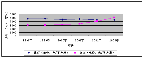 但從動(dòng)態(tài)上看,商品房空置面積并沒(méi)有增加,而是呈下降趨勢(shì)。2004年8月底,商品房空置面積0.97億平方米,同比減少0.8%,比去年底減少3%。這說(shuō)明當(dāng)前的房地產(chǎn)空置問(wèn)題并未惡化。我們認(rèn)為,對(duì)于房地產(chǎn)空置現(xiàn)象,必須從兩個(gè)方面認(rèn)識(shí):一方面,房地產(chǎn)空置占?jí)捍罅抠Y金,其中部分形成不良資產(chǎn);另一方面,一定規(guī)模的空置對(duì)正常的房地產(chǎn)市場(chǎng)是完全必要的,它實(shí)際上在某種意義上是一種“庫(kù)存”,從而發(fā)揮平抑房?jī)r(jià)的作用。從圖3的對(duì)比可以看出,上海市近幾年房地產(chǎn)供銷兩旺,不僅沒(méi)有出現(xiàn)大量空置,連部分以前積壓的房子也賣出去了,而房?jī)r(jià)表現(xiàn)為一路飆升;北京市則房?jī)r(jià)比較穩(wěn)定,甚至穩(wěn)中有降,其中房地產(chǎn)空置對(duì)房?jī)r(jià)上升起到的抑制作用不可忽視。