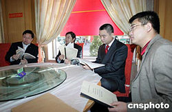 大連實德俱樂部董事長徐明(左一)、北京國安俱樂部總經(jīng)理羅寧(左二)、深圳鍵力寶老總張海(右二)等準備會議材料。