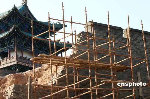 10月17日坍塌的山西平遙古城墻的修復(fù)工作于10月26日開始,城墻邊上的腳手架已經(jīng)開始建立,平遙文物局的工作人員已經(jīng)開始對城墻的基礎(chǔ)開始進(jìn)行測量,同時,部分施工人員也于26日進(jìn)駐工地。作者:魏駿