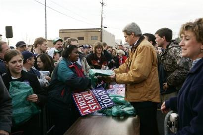 圖為2日當天克里在威斯康星州分發(fā)競選宣傳材料的一個場景,克里的一名女支持者手里拿著的雜志,是民主黨總統(tǒng)候選人克里簽過名了的一本競選宣傳資料。(固山)
