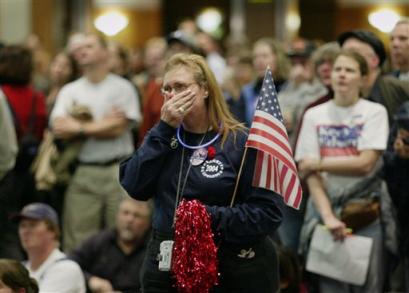 中新網(wǎng)11月3日電 據(jù)美聯(lián)社報(bào)道,美國東部時(shí)間2004年11月2日(北京時(shí)間11月3日),在俄勒岡州西北部城市波特蘭舉行的美國民主黨俄勒岡州選舉集會(huì)上,為今年總統(tǒng)大選捏一把汗的特里薩·蒂特爾緊張地盯著反映兩位總統(tǒng)候選人得票情況的大屏幕,下意識地用手捂住了自己的嘴。(春風(fēng))