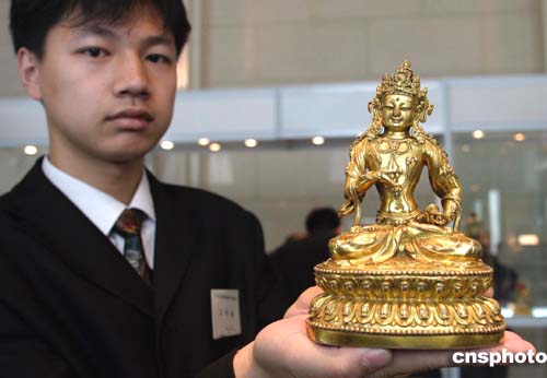 明代永樂年間的一尊銅鎏金金剛薩埵佛像以一百一十萬元人民幣成交,遠(yuǎn)高于估價(jià)。該佛像用紅銅以失蠟術(shù)注澆而成,蓮座上鐫刻楷書陰識“大明永樂年施”,為明代宮廷造像,是當(dāng)時(shí)的中央政府賜贈(zèng)藏傳佛教高僧的禮物,被學(xué)術(shù)界稱為“永樂青銅塑像”。作者:張煒