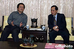 11月8日,大陸美術(shù)專業(yè)人士訪問團(tuán)參訪了臺(tái)北故宮。圖為訪問團(tuán)團(tuán)長、中國美術(shù)館館長馮遠(yuǎn)(左)與臺(tái)北“故宮博物院”副院長林柏亭交談,表示將加強(qiáng)交流與合作。中新社記者:董會(huì)峰
