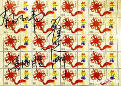 由中國航天第一人楊利偉及飛天預(yù)選航天員聶海勝、瞿志剛親筆簽名,并隨“神州五號(hào)”一起遨游太空的《神五搭載紀(jì)念郵票》,十一月九日亮相申城。圖為該郵票三個(gè)整版之一的同心結(jié)版。作者:湯彥俊
