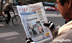 十一月十一日下午四時(shí)許,眾多北京市民默默在街邊報(bào)亭購買北京首家登載阿拉法特去世消息的《北京晚報(bào)》,詳細(xì)觀看有關(guān)新聞。中新社記者:鄒憲