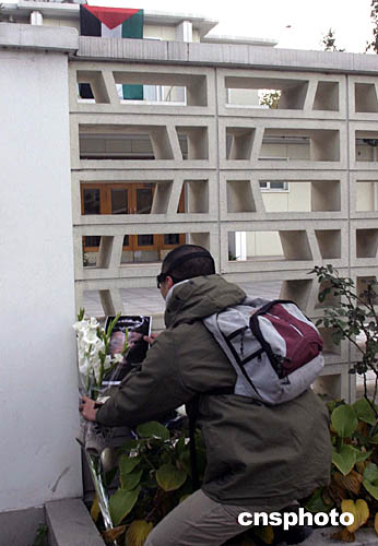 十一月十一日下午,由一些北京市民和學(xué)生自發(fā)敬獻(xiàn)的一簇簇鮮花擺放在巴勒斯坦國(guó)駐華使館門(mén)前,表達(dá)他們對(duì)巴勒斯坦國(guó)總統(tǒng)、巴民族權(quán)力機(jī)構(gòu)主席阿拉法特的哀悼。阿拉法特當(dāng)天在法國(guó)巴黎病逝。中新社記者:張煒