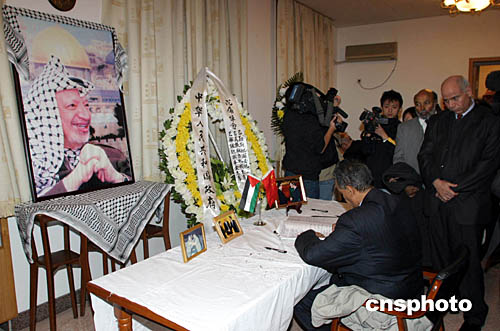 十一月十一日晚,各國駐華使節(jié)紛紛來到巴勒斯坦國駐華大使館,吊唁當(dāng)日去世的阿拉法特主席。中新社記者:史利