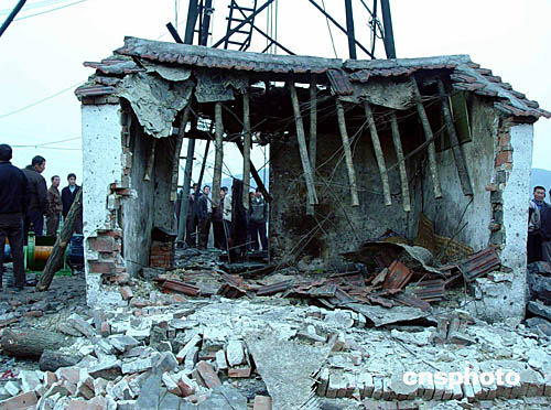 圖為十一日瓦斯爆炸現(xiàn)場(chǎng)被震毀的房屋。