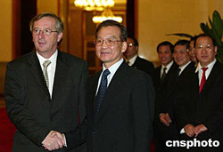 溫家寶說,中歐關(guān)系正在深入發(fā)展,政治交往十分密切,擴大后的歐盟已成為中國最大的貿(mào)易伙伴,雙方在科技、文化等領(lǐng)域的合作也日趨深入。事實表明,中歐合作水平日益提高,鞏固和發(fā)展雙邊關(guān)系符合中歐的現(xiàn)實和長遠利益。在當前形勢下,中歐應(yīng)從戰(zhàn)略的高度著眼,不斷充實和發(fā)展中歐全面戰(zhàn)略伙伴關(guān)系,共同致力于世界的和平、穩(wěn)定與發(fā)展,溫家寶強調(diào),十二月上旬中歐將舉行第七次領(lǐng)導(dǎo)人會晤,中方希望這次會晤在推動中歐關(guān)系發(fā)展方面取得新的積極進展。