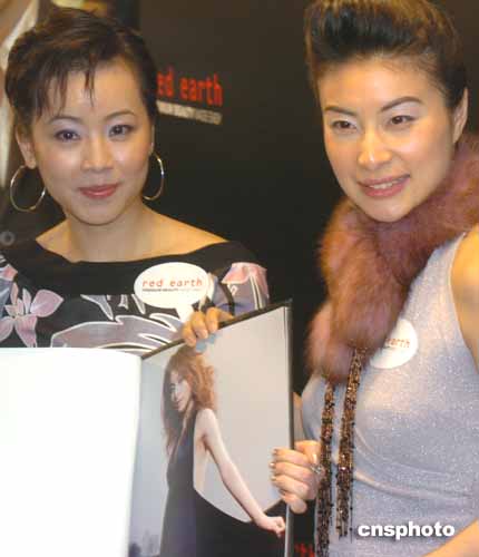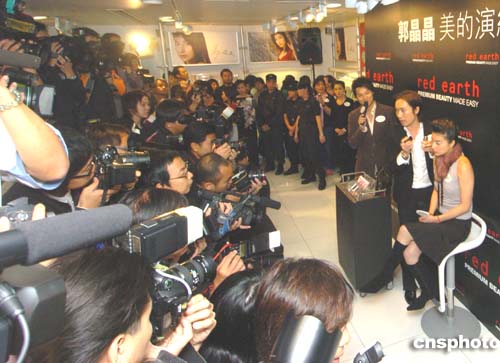 郭晶晶在現場接受化妝品公司高層贈送的禮品。作者:趙振清