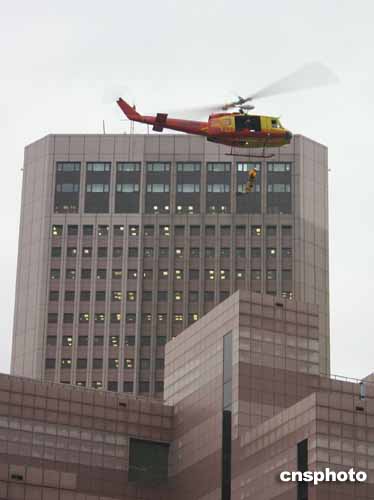 二零零四“亞洲消防首長協(xié)會”年會十一月十七日在臺北舉行。臺灣島內(nèi)特搜隊員表演直升機滯空下降。作者:董會峰