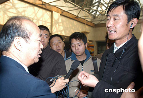 11月24日中午,11.21空難事故調(diào)查組在包頭賓館舉行發(fā)布會后,一名遇難者生前摯友(右)向調(diào)查組官員詢問事故調(diào)查進展以及善后處理情況。中新社記者:張宇