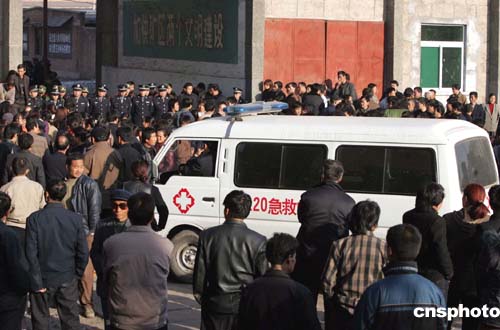 十一月二十九日下午,救護(hù)車(chē)在發(fā)生瓦斯爆炸事故的陜西銅川礦務(wù)局陳家山煤礦外待命,隨時(shí)準(zhǔn)備救治至今下落不明的礦工。作者:任晨鳴