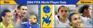 國(guó)際足聯(lián)公布的2004年世界足球先生的最終3名候選人是:法國(guó)的亨利(英超阿森納俱樂(lè)部)、巴西的羅納爾迪尼奧(西班牙巴塞羅那俱樂(lè)部)和烏克蘭的舍甫琴科(意大利AC米蘭俱樂(lè)部)。