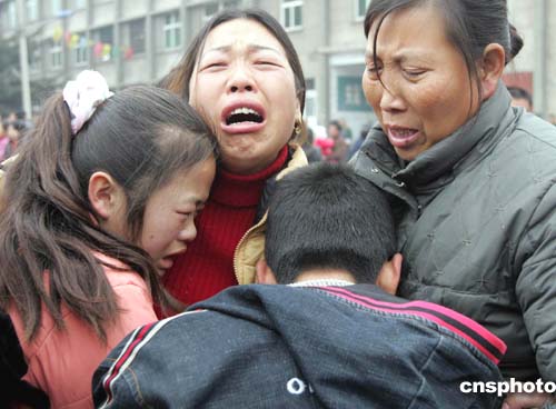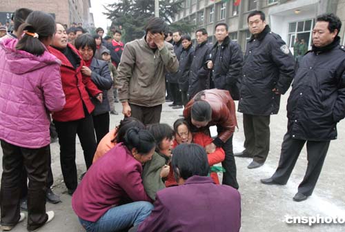 剛剛趕到陳家山煤礦的陜西富平籍礦工王喜財?shù)钠拮訃?yán)慧(中)和兒子抱頭痛哭。作者:任晨鳴