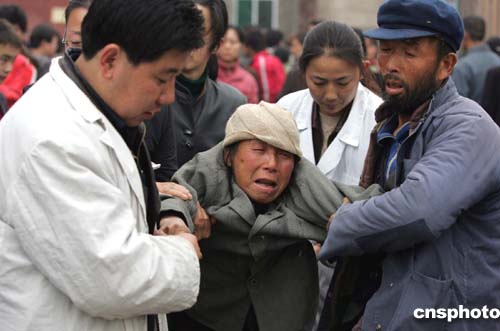 十一月三十日,陜西陳家山礦難指揮部發(fā)布六十三名礦工死亡,一百零三人下落不明的消息后,許多感到親人生還無望的礦工家屬悲痛過度,煤礦醫(yī)院醫(yī)務(wù)人員在現(xiàn)場緊急救治。作者:任晨鳴