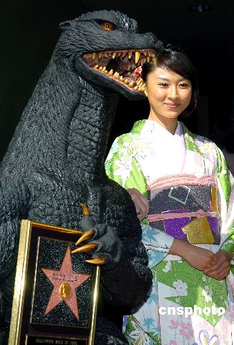 11月29日,又一位明星被載入美國好萊塢星光大道,成為這條大道上的第2271顆星。不過,這位明星并非人類,而是曾經(jīng)令無數(shù)觀眾癡迷的巨怪“哥斯拉”。這個日本人創(chuàng)作的恐怖災(zāi)難片巨星在美國與“金剛”齊名,可謂是家喻戶曉。圖為“哥斯拉”在留名典禮上,在這個重要場合,連它也少不了美女相伴。Ic/cnsphoto