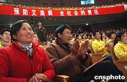 十二月一日,中國內(nèi)地演員濮存昕(右一)、蔣雯麗(左一)在“關(guān)注婦女,抗擊艾滋”活動上,與來自四川資中公民鎮(zhèn)的艾滋病毒攜帶者同臺獻(xiàn)藝,該艾滋劇團(tuán)是由四川資中縣近二十名艾滋病感染者自發(fā)組建的。作者:韓藝冰