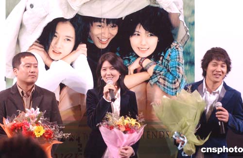 十二月三日,二零零四北京韓國電影展在北京新世紀(jì)影院舉行首映式,韓國導(dǎo)演姜帝圭、金基德、金容華、李翰,演員車太賢、李恩宙、張伸瑛等明星集體亮相。圖為韓國導(dǎo)演李翰(左一)、李恩宙(中)車太賢(右一)在觀眾見面會上為《向左走向右愛》造勢。作者:韓藝冰