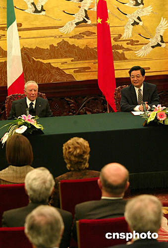 圖:胡錦濤與意大利總統(tǒng)錢皮共同會見記者