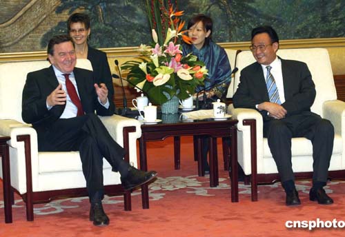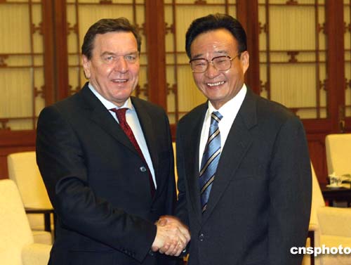 施羅德贊同吳邦國(guó)對(duì)德中關(guān)系的評(píng)價(jià)。他說(shuō),中德關(guān)系建立在相互信任的基礎(chǔ)上,各個(gè)方面的合作都很好。德國(guó)政府重視德中關(guān)系,將繼續(xù)堅(jiān)持一個(gè)中國(guó)政策。德方愿進(jìn)一步加強(qiáng)兩國(guó)議會(huì)業(yè)已存在的良好合作關(guān)系。同時(shí),愿繼續(xù)加強(qiáng)與中國(guó)的民間交往,以及文化交流。德方愿與中方一道使德中關(guān)系始終保持高水平的發(fā)展。