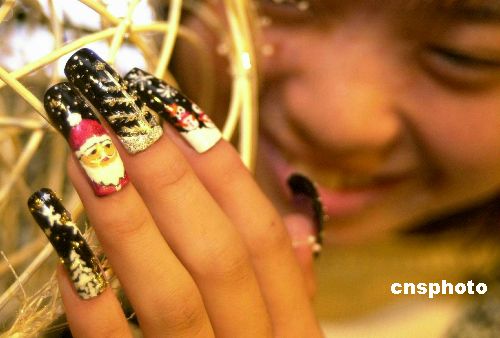 12月5日,市民張小姐在美甲中心為自己的指甲增添的一個圣誕老人和飄著雪花的圣誕樹。據(jù)介紹,這些“圣誕老人指甲”全部是手繪在人造指甲片上,然后使用特殊的粘貼工藝與正常指甲結(jié)合的天衣無縫,一個多月也不會脫落。圣誕節(jié)臨近,這種獨具個性的“圣誕”指甲受到許多新潮女孩的喜愛。趙健鵬 攝