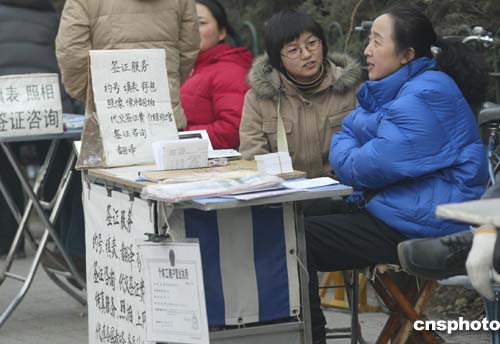 十二月八日,美國(guó)大使館簽證處門口的個(gè)體服務(wù)一條龍生意火爆,前來(lái)咨詢的北京市民絡(luò)繹不絕。