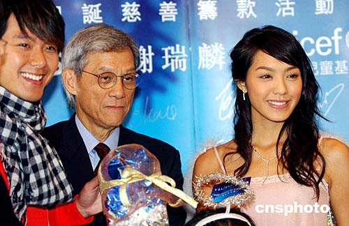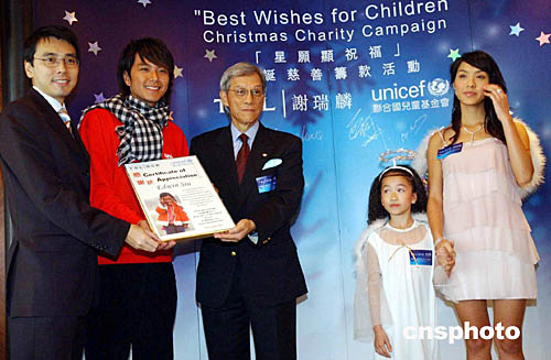 為《中國兒童周》教育項目籌募經(jīng)費。聯(lián)合國兒童基金會香港委員會主席馮慶彪、謝瑞麟執(zhí)行董事陳偉康[左]向明星蕭正楠頒贈感謝狀,感謝蕭正楠應(yīng)邀擔(dān)任親善之星。
