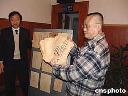 十三日下午,專程從臺(tái)灣趕來(lái)的原南京審判日本戰(zhàn)犯軍事法庭審判長(zhǎng)石美瑜遺孀石沈和玉攜子石南陽(yáng),向侵華日軍南京大屠殺遇難同胞紀(jì)念館捐贈(zèng)了南京審判日本戰(zhàn)犯軍事法庭的起訴書、判決書、會(huì)議記錄、詢問(wèn)記錄、照片、書籍等一百一十七件珍貴史料。圖為捐贈(zèng)現(xiàn)場(chǎng)。作者:王曉紅
