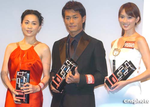 港臺紅星劉嘉玲﹑古天樂﹑林志玲14日晚在香港會展中心身著紅﹑黑﹑白主題色調(diào)服裝同臺出席諾基亞7280流動電話推出儀式。作者:趙振清