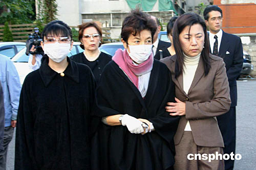 圖為靈車(chē)正將遺體送暫厝地,家屬在后護(hù)送。