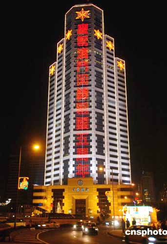 位于澳門繁華地段的中國(guó)銀行大廈,早早亮起了慶祝澳門回歸祖國(guó)五周年大型霓虹燈標(biāo)語(yǔ),給這座不夜城增添了濃郁的節(jié)日喜慶氣氛。作者:宋吉河