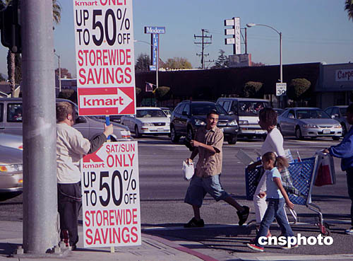 十二月十八日的美國(guó)洛杉磯街頭,一位打工男孩在烈日下手舉超級(jí)市場(chǎng)周末圣誕大減價(jià)的指示牌,吸引來(lái)往車流人群前往采購(gòu)。中新社記者:賈國(guó)榮