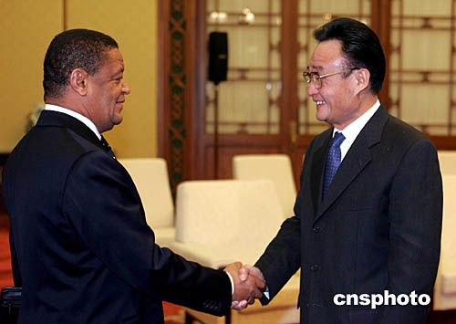 吳邦國說,中國與埃塞俄比亞有著深厚的傳統(tǒng)友誼,建交三十多年來,兩國在政治、經(jīng)貿(mào)、文教、衛(wèi)生等領(lǐng)域及國際事務(wù)中進(jìn)行了真誠有效的合作,取得了令人滿意的成果。近年來,雙方進(jìn)一步加強(qiáng)高層交往,積極探索互利合作的新方式,新途徑,為雙邊關(guān)系發(fā)展注入了新活力。中方高度重視與埃塞俄比亞的友好合作,愿與埃塞俄比亞一道推動(dòng)兩國全面合作伙伴關(guān)系不斷向前發(fā)展。