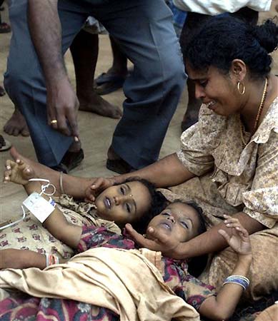 圖為印度海岸一座小鎮(zhèn)上,一位母親悲痛欲絕的坐在海嘯中死去的兩個女兒身邊。(固山)