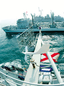 此次演練中,補給演練尤其引人注目。當中方指揮員張盤洪少將下達補給命令后,“哈爾濱”號、“拉圖什特威爾”號和“比羅司令”號3條戰(zhàn)艦呈倒品字形圍繞“洪澤湖”號航行,先后進行了3艦同時補給和單艦補給模擬演練。據了解,補給演練內容是延長戰(zhàn)斗力的訓練課目,是檢驗海軍遠海聯(lián)合作戰(zhàn)能力的訓練。