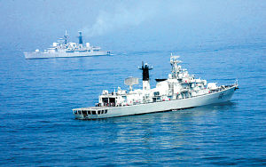 6月20日上午,薄霧中的黃海蒼茫雄渾。由中國海軍“哈爾濱”號導彈驅逐艦、“洪澤湖”號遠洋補給艦與來訪的英國皇家海軍“?巳亍碧枌楎屩鹋灩餐M成的艦艇編隊在黃海某海域進行了一場緊張驚險的海上聯(lián)合搜救演習。