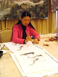 十二月二十九日,在“紀念人民藝術家齊白石誕辰一百四十周年全國書畫萬里行”廣州站的展覽、筆會活動上,藝術大師齊白石孫女齊慧娟面向廣州市民即席揮毫作畫。作者:郭軍